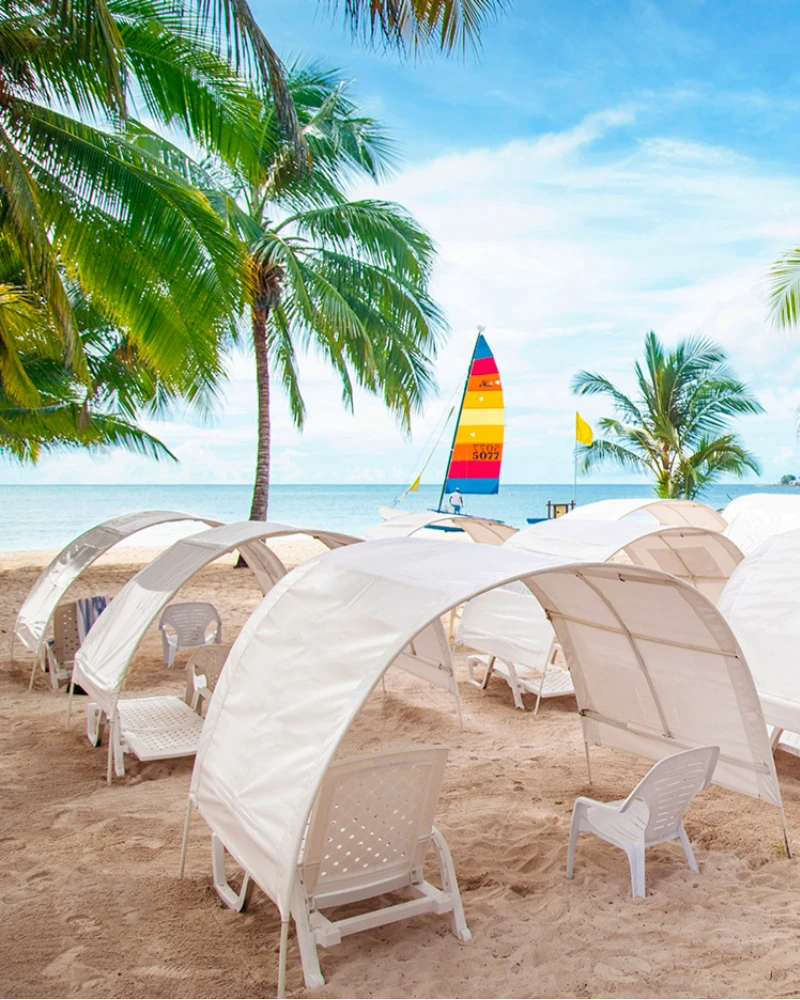 A solo 5 minutos del hotel. Te llevamos varias veces al día. Incluye snacks, bebidas ilimitadas, carpas, toallas y sillas asoleadoras.